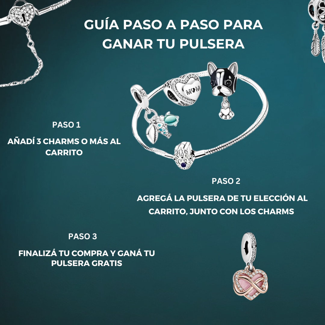 Comprando 3 charms, podés elegir una pulsera de regalo. Solo tenés que agregar los 4 productos al carrito y el descuento se aplica automáticamente.